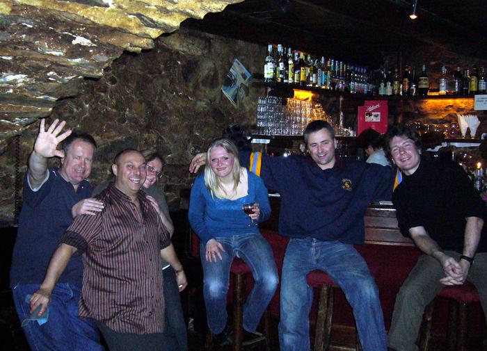 At Bar Ippo... Left: Franco / Right: Nick _________________ Another season passed and Franco was now to be found managing bar 'King' (get it?) At Bar King... Left to right: Gerry, Franco, Woody (on his knees again), Andy, and Steve ________________ Now he's gone and left the village!... He can be found at La Vacherie on the Aosta road out of Pre St. Didier. It's a fantastic restaurant with a night club bar below. Well worth a trip to. At La Vacherie... Left to right: Woody, Franco, Ali, Anna, Nick and Tony